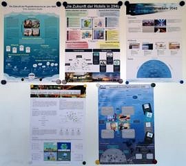 Die Ergebnisse, die u. a. auf Interviews mit Branchenexperten basierten, wurden in Form eines Posters für die anderen Gruppen ausgestellt. Außerdem präsentierten und diskutierten die jeweiligen Gruppen ihre Poster und Ideen mit ihrem Publikum. Kontroverse Annahmen wie ein Flugticket von Frankfurt nach New York für unter 15 Euro regten die Diskussion an, ebenso wie ein Augenzeugenreport des Matrosen José.